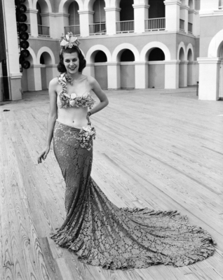 1938 Casa Manana Review; Mary Paige Covey wears trailing lavendar lace with lilac bodice and headress, 07/25/1938. Casa Manna is in the background.
