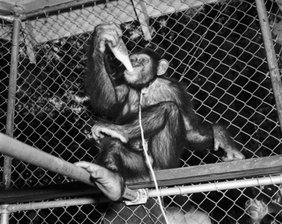 Ape at Forest Park Zoo, Fort Worth, drinking from bottle, 08/4/1938
