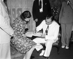 Democratic-nominate for Texas governor W. Lee O'Daniel and his daughter Molly sign guest book at the governor's mansion as guests of Governor Allred, 08/10/1938. There are three more individuals in the picture witnessing the signature.