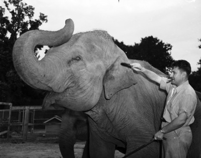 Queen Tut, elephant being groomed by unidentified zoo keeper, Forest Park Zoo, Fort Worth, 08/10/1938