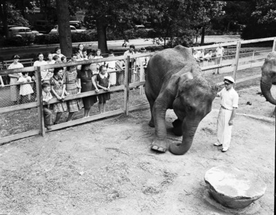 Birthday party for Forest Park Zoo's 18-year-old elephant, Queen Tut, shown here with assistant zoo director Julian Frazier, 08/12/1938. The image shows Queen Tut and Julian Frazier in the elephant enclosure with several spectators.