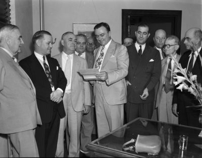Governor-nominate W. Lee O'Daniel reads invitation for the Midland Cowboy Contest in his new office in Petroleum Building; from left, John B. Collier Jr., John N. Sparks, Ed. Winton, O'Daniel, Lionel Bevan, Jack Dressing, and Sidney L. Samuels, 08/13/1938