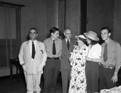 Amarillo celebration of opening of the Will Rogers Memorial Highway; from left, New Mexico Governor Clyde Tingley; Bill Rogers (son), Amon Carter, Mrs. Tom McSpadden (sister), and Mr. and Mrs. Jimmy Rogers (son), 08/15/1938