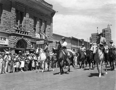 Celebration in Amarillo for opening of Will Rogers Memorial Highway; sons of the late Will Rogers, sons of the late Will Rogers, Bill and Jimmy with Jimmy's wife riding at head of the parade, 08/15/1938
