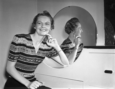 Marjorie Maddox, queen of Nocona, Texas, takes a bow at Casa Manana with a visiting delegation of 45 townspeople from Nocona. Maddox is shown sitting next to a mirror, facing the camera, and smiling.