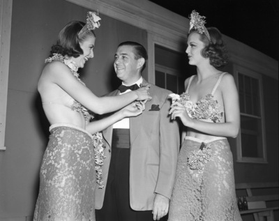 Casa Manana showgirls, from left, Lauretta Jefferson, Christine Harris, and Mary Paige Covey on back of train enroute to New York on trip to London, 08/24/1938. Two of the girls are standing next to a man and smiling.