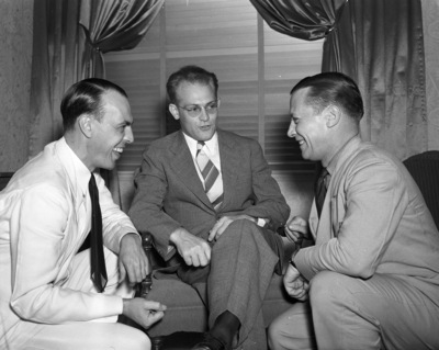 Officials of American Airlines in Fort Worth for sales operations conference at Blackstone Hotel; from left, T.W. Brooks, Newt Wilson, and M.D. Miller, all from Chicago, 08/30/1938