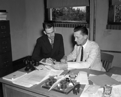 Arlington ISD school superintendent Ben Everitt (right) talks with new Arlington High School principal, W.R. Wimbish, (left). Both men can be seen sitting down at a desk discussing and looking at some paperwork, both are wearing suits.