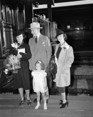 Mr. and Mrs. Amon G. Carter and daughter Ruth and a little girl not identified before Ruth leaves for Madeira School, Greenway, Va., 09/22/1938. They are standing in front of the railway and a train. All of the them are wearing hats except for the little girl.