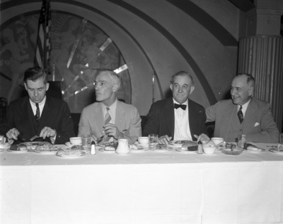 Chamber of Commerce luncheon, Blackstone Hotel, honoring Secretary of Agriculture Wallace; from left, Secretary Wallace, Cliff Day, Senator Tom Connally, and Amon Carter, 09/30/1938. They are all seating next to each other and at a table