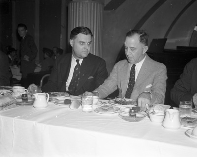 Chamber of Commerce luncheon, Blackstone Hotel, honoring Secretary of Agriculture Wallace; from left, Burris Jackson of Hillsboro and Gaylord J. Stone, president of Chamber of Commerce, 09/30/1938. They are seating at a table with food on top.