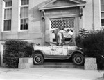 The south entrance to the Texas Christian University Administration Building was blocked with a car by students celebrating the school's football victory over Temple at Philadelphia. The car was parked on the staircase of the entrance to the building, there is a sign on the car's door that reads, "TCU" there is no sign of the model of the car. The two students can be seen standing on the car's hood.