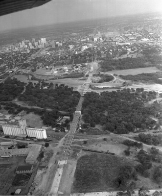 Air view of construction of Lancaster Avenue bridge and overpass with downtown Fort Worth skyline in upper left corner of photo, 10/10/1938