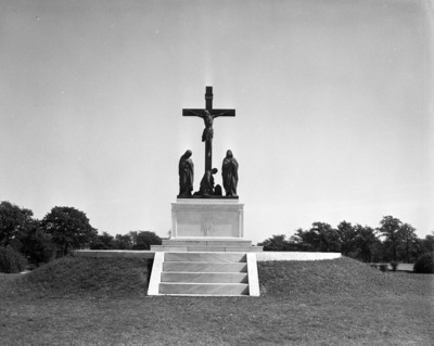 Altar and crucifixion scene at Mount Olivet Cemetery, where a Catholic high mass will be celebrated for feast of All Holy Souls, 10/22/1938