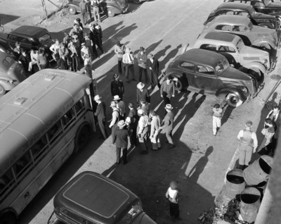 Twenty federal prisoners file out of Tarrant County Jail to board a bus to Dallas to comply with order from Federal Bureau of Prisons; Fort Worth jail failed to make improvements in their facility, 10/24/1938