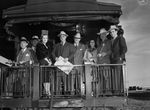 Left to right: Dan Levy, Bert Honea, Mrs. Amon Carter, Charles F. Roeser, E. A. Landreth, Ruth Carter, Amon Carter and Amon Carter Jr. The group is aboard a Star-Telegram special train en route to the Sugar Bowl football game in New Orleans, Louisiana. The men are dressed in suits, ties, vests and hats. The women are wearing dresses and coats. Mr. Roeser is holding a paper in his hands.