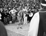 Shot from the Texas Christian University (TCU) versus Carnegie Tech Sugar Bowl football game. Amon Carter is standing on the field in middle of a crowd of people. He has his arms stretched out in front of him and he is holding his hat in his left hand. He is wearing a suit and cowboy boots.