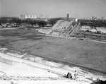 Construction of Farrington Field, football stadium for high school games, looking northeast toward 7th Street, Montgomery Ward, and downtown Fort Worth, 01/06/1939