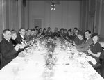 Senior Texas Christian University (TCU) Frogs (students) and their dates at a dinner and theater party given by Amon Carter (seated at the head of the table) following their win at the 1939 Sugar Bowl in New Orleans. Seated left to right: Clifford Kellow, Miss Olive Tucker, Paul Snow, Pat Clifford, Forrest Kline, Bob Jordan, Arthur Moseley (student manager), I. B. Hale, Miss Virginia Kingsbury, Miss Dorothy Pope, Ki Aldrich, Amon Carter, Frances Buster, Davey O'Brien, Hazel Smith, Russell Hensch, Lacy McClanahan, Mary Helen Lancaster, Johnny Hall and Ema Jean Haggard. The group is sitting at a dinner table with plates, cups and cutlery in front of them. All the students are holding small figurines.