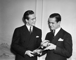 Pat and Mike O'Daniel, sons of Texas Governor Wilbert L. O'Daniel, looking at a horse shoe.