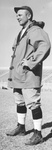 Dutch Meyer, football coach for Texas Christian University (T.C.U.). He can be seen standing in the field, he is wearing a long coat, a cap, and he has his hands on his waist.