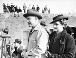 Amon G. Carter Sr. and Mrs. Enid Justin, Chairman of the Nocona Committee on publicity in charge of the Pony Express Race. In the background are several spectators watching the race.