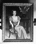 Portrait painting of Mrs. Amon G. Carter. In the painting Mrs. Carter is sitting on a chair and behind her is a side table with a potted plant. She is wearing a short sleeve dress with high heeled shoes. She has her right hand on the arm of the chair and her left hand on her lap.