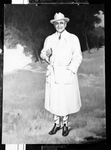 Portrait painting of Amon G. Carter. In the painting Carter is wearing an overcoat with cowboy boots and a cowboy hat. He is standing outdoors, holding a cigar in his right hand. There are trees in the background.