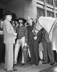 Presentation of Palomino saddle horse to Amon Carter. Standing left to right: Amon Carter, Lloyd Jinkins and F. J Adams. Mr. Carter and Mr. Adams are wearing suits and hats. Mr. Jinkins is dressed in a plaid shirt, trousers with chaps, and a hat, and he is wearing a fake mustache and beard while carrying a bag that reads "Pony Express". There is a large crowd of people standing in the background.