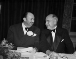 Appreciation dinner for Amon Carter Sr. at the Fort Worth Club. Amon Carter (right) is seated with an unidentified man at a dinner table. They are both wearing tuxedos. On the table is a partial view of a flower centerpiece, the dinner program, eyeglasses and some plates.