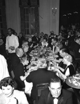 Appreciation dinner for Amon Carter Sr. at the Fort Worth Club. Several guests are pictured sitting at dining tables. On the tables are cups and plates of food. There are servers walking around the room and attending the tables.