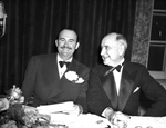 Amon Carter Senior, left, smiling at a man sitting next to him. This photo was taken during the appreciation dinner for Amon Carter Senior at the Fort Worth Texas Club.