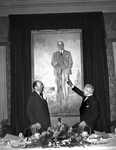 Two men standing in front of a portrait of Amon Carter Senior during his appreciation dinner at the Fort Worth Texas Club.