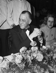 An unidentified man seated at a table next to an unidentified woman at an appreciation dinner for Amon Carter Sr. at the Fort Worth Club.
