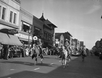 Paul Whiteman (left) and Amon Carter (right) riding horses at the head of the parade which opened the 43rd Southwestern Exposition and Fat Stock Show. In the background are spectators, cars, and various stores and shops.