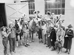 Group from Stamford, Texas, extending Cowboy Reunion invitations to Amon Carter and Paul Whiteman. Mrs. Joe Benton (far left) is pinning a badge on Paul Whiteman. Mrs. C. B. Gray is pinning a badge on Amon Carter, at the right. Charles E. Coombes is standing between the two horses to be ridden by Whiteman and Carter in the opening parade of the reunion. W. G. Swenson, of Stamford, is standing beside Mrs. Gray. Others in the group are Mrs. L. I. Bennett, Miss Lou Lou Williams, Stephen Bennet, Mr. and Mrs. Lawrence Crider, Mr. and Mrs. John Braswell, Joe Benton, C. B. Gray, Mrs. Fannie Williams and Mrs. Charles E. Coombes. Several people in the background are holding up their cowboy hats.