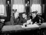 Seated at a desk, left to right: Amon Carter Sr., Davey O'Brien, of Texas Christian University, and Bert Bell, owner and coach of the Philadelphia Eagles. Mr. O'Brien has a pen and paper in his hands. On the table is an inkwell and a figurine of O'Brien in his football uniform.