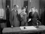 Standing left to right: Amon Carter, Davey O'Brien, Texas Christian University football player, and Bert Bell, of the Philadelphia Eagles. O'Brien is holding a football; printed on the football is "Sugar Bowl 19 Classic 39 T. C. U. 15 Carnegie 7." On the table in front of them is a pen, an inkwell and a figurine of O'Brien in his football uniform.