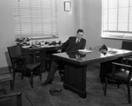 Fort Worth City Manager Dudley Lewis behind walnut desk at his new office in the new City Hall, 10th and Throckmorton, Fort Worth, Texas 03/24/1939