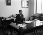 At the new Fort Worth City Hall, 10th and Throckmorton, City Engineer W.O. Jones at his desk, 03/24/1939. There are two photographs hanged on the wall behind him. There is a desk behind him, two chairs to the right side of the room next to a window.