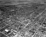 Aerial view of Ennis, Texas includes the Southern Pacific Station, Ennis Tag and Salesbook Plant, public schools, Saint John's Church, City Hall Fire Station and Public Library.