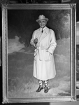 Framed portrait painting of Amon G. Carter. In the painting Carter is wearing an overcoat with cowboy boots and a cowboy hat. He is standing outdoors, holding a cigar in his right hand. There are trees in the background.