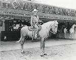 Amon G. Carter, Sr. riding a horse in front of his Shady Oaks Farm saloon. Mr. Carter is in western wear smoking a cigar. There is a large sign with the words "Howdy Strangers" mounted on the saloon.