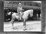 Copy photo of Amon Carter on Palomino horse in front of open bar at Shady Oaks Farm.