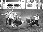 Copy negative of Smoky Snyder, left, and Homer Holcomb, right, in action during bullriding event at Fort Worth Southwestern Exposition and Fat Stock Show, North Side Coliseum, 05/23/1939