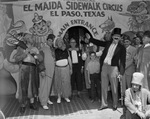 All-State Shrine Ceremonial and Jubilee in Fort Worth; Sidewalk Circus created by El Maida Temple, El Paso; director is Ben Turner (in mustachio) with performers Doc Snyder, C. Caldarella, Franklin Bull, Karl Cottle, and Walter Schott, 05/26/1939. They are all standing at the main entrance.