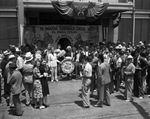 All-State Shrine Ceremonial and Jubilee in Fort Worth; Sidewalk Circus created by El Maida Temple, El Paso; director is Ben Turner (in mustachio) with performers Doc Snyder, C. Caldarella, Franklin Bull, Karl Cottle, and Walter Schott, 05/26/1939. There are a lot of people gathered around the circus performers.