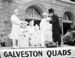 All state Shriners Association in Fort Worth parade through downtown Fort Worth, Texas; El Mina Temple of Galveston mimic Galveston's Badgett quadruplets, four 200-pound nobles in baby clothing. Participants in the stunt were, left to right, C. C. Wheeler, nurse; O. T. Robinette, W. Lee Burns, W. P. Sexton, and Karl Brehm, quads, and Dr. F. J. Offer.
