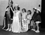 Royal Court for the Juvenile Harmony Club's Star-Telegram Free Milk and Ice Fund benefit; from left, Lucian Morgan, Barbara Sue Freeman, Ann Morgan, Tandy Ray Freeman, Roselle Cooles, Johnnie Meroney, 05/29/1939. The six children are lined up one behind of another. They all are wearing royal costumes.