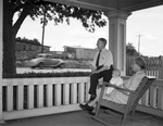 Mr. and Mrs. A. H. Brandt with four-month-old grandson, George Edward Brandt, on front porch of their residence [built in 1909] at 1704 E. Lancaster Ave., Fort Worth, 05/31/1939 . Mrs A. H Brandt is seating on a rocking chair holding the baby while Mr Brandt is seating on the railing of the porch. On the background there is an automobile passing by.